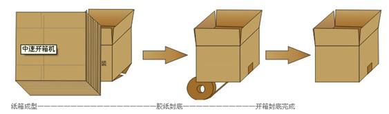 開箱機是指自動完成開箱、成形、下底折葉折曲。并現(xiàn)時完成下部分膠帶粘貼,將疊成紙板的箱板打開,箱子底部按一定程序折合,并用膠帶密封后輸送給裝箱機的專用設備。自動紙箱成型機、自動開箱機是大批量紙箱自動開箱、自動折合下蓋、自動密封下底膠帶的流水線設備,機器全部采用PLC+顯示屏控制,大大方便操作,是自動化規(guī)模生產(chǎn)必不可少的設備。